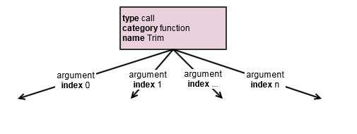 Represents all function/routine calls. There is one child per argument used for the call, each connecting Edge is labeled as argument and has an index property which indicates which argument child represents.