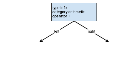 Infix Vertex types represent operations with two operands separated by an operator. Addition (5 + 3) and Concatenation ("Hello" : " world!") are two examples of infix operations. Infix operations a grouped into multiple subtypes called a category, all of which have to children connected by edges: a left edge and a right edge.