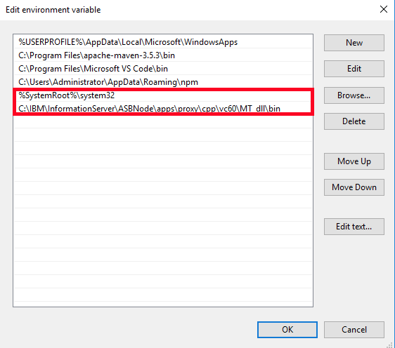%SystemRoot%\system32<DataStage Client Installation Path>\ASBNode\apps\proxy\cpp\vc60\MT_dll\bin