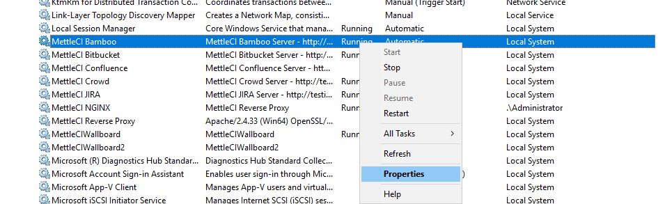 Locate the Bamboo Remote Agent in the Windows Services settings, right click and select “Properties”.