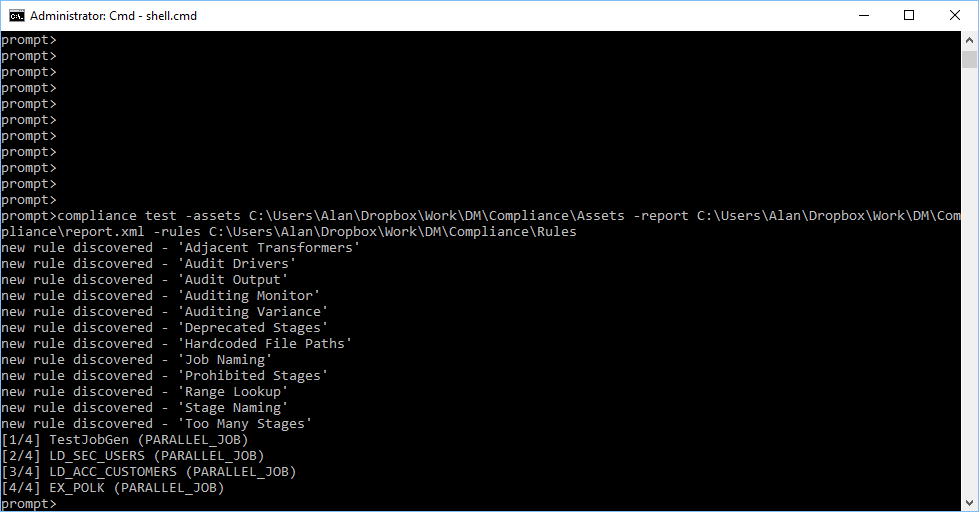 The development environment consists of a simple command line interface (Java-based, with scripts for both Windows and Linux provided) that loads the MettleCI Compliance plugin and allows Compliance Rules to be executed against the exported DataStage jobs.The MettleCI suite as installed features a number of standard Compliance Rules that it executes against the ISX archive files it creates to manage DataStage jobs.