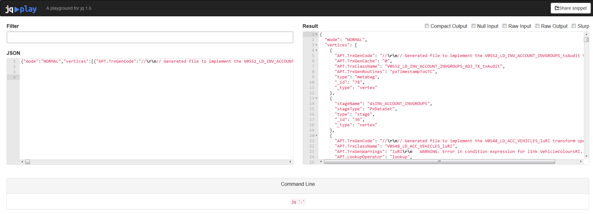 Note that the filter parameter was set to . to ensure the entire json document was processed.