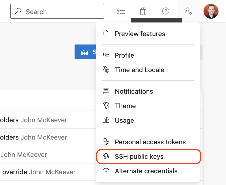 Next we’ll add the public key to Azure DevOps Services/TFS. Open your security settings by browsing to the web portal and selecting your avatar in the upper right of the user interface. Select Security in the menu that appears.
