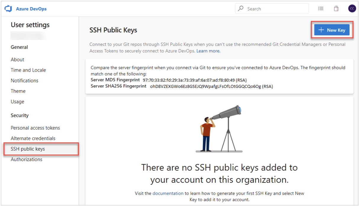Select SSH public keys, and then select + New Key.
