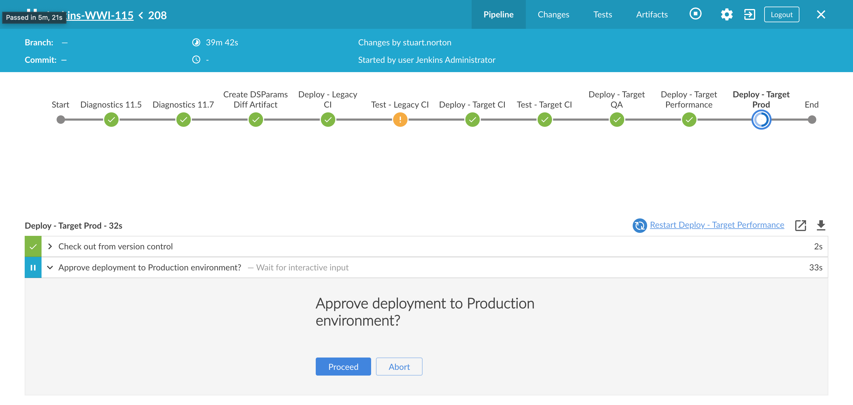 You may want to configure your pipeline to wait at certain points for a human to manually approve the pipeline to proceed. You can do this most simply using the input step plugin which will pauses Pipeline execution and present some configured text along with proceed and abort options: