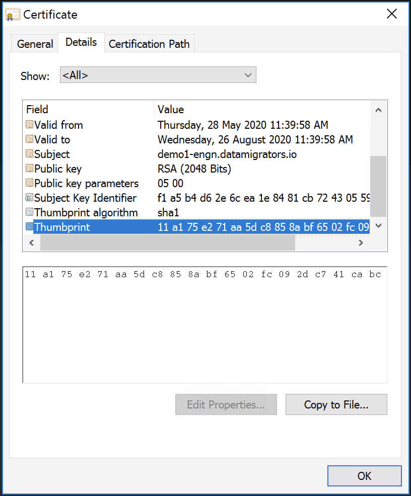 The Thumbprint value should match the appropriate value displayed by the keytool -list command you entered when you first generated your certificate keystore.