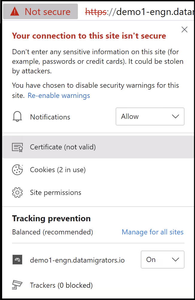 Typically, when you first connect to Workbench using HTTPS you will see a certificate error in your browser. This may look like this…