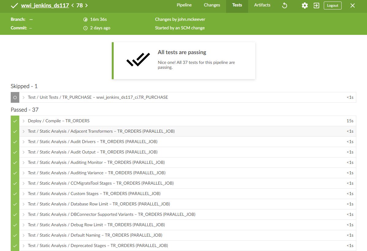 DataStage job compilation, MettleCI Compliance testing, and MettleCI Unit testing are all exposed as xUnit (JUnit-compatible) XML files, and so appear as tests in the Jenkins Tests tab, with expansion icons which let you view additional details, where appropriate. Tests might be shown as “skipped” when they were run in a previous build and there has been no change in the underlying assets to merit a retest.