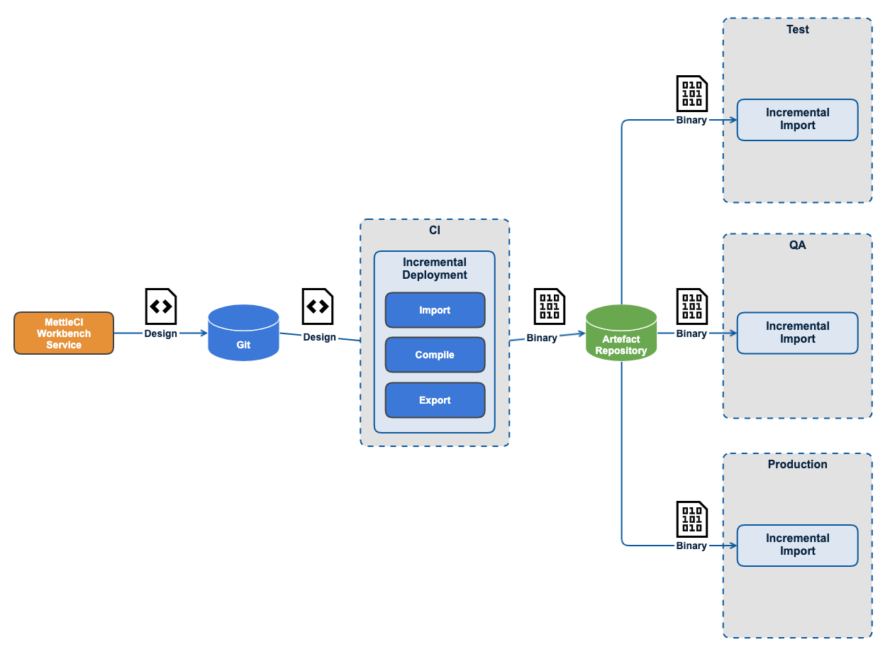 MettleCI CLI’s capabilities can be used to implement both of the deployment scenarios ('binary only' or ‘compile on target’, described above) by using its different options.