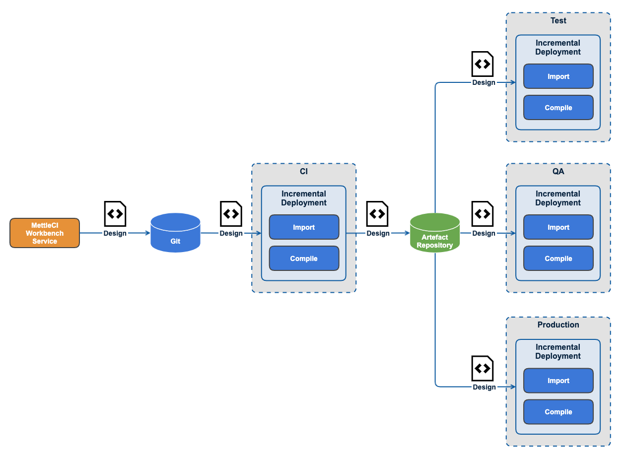 Where possible, Data Migrators recommend that users employ the MettleCI CLI’s datastage deploy command to ensure the integrity of your import and compile process. This effectively performs an incremental isx import and isx compile in tandem. The source ISX files for Continuous Integration come from Git and, when successful, a Release is created using the source ISX files. All downstream environments use the same deployment process, the only difference being that source ISX files come from the release artefacts rather than Git:
