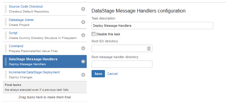 The Plugin includes a task that will read all Message Handlers that follow the "<Job Name>.msh" naming convention and "inject" them into the ISX file of the corresponding Job during deployment. The updated ISX file can then be deployed like normal, resulting in both the Job design and Job-Level Message Handler ending up in the target DataStage instance.