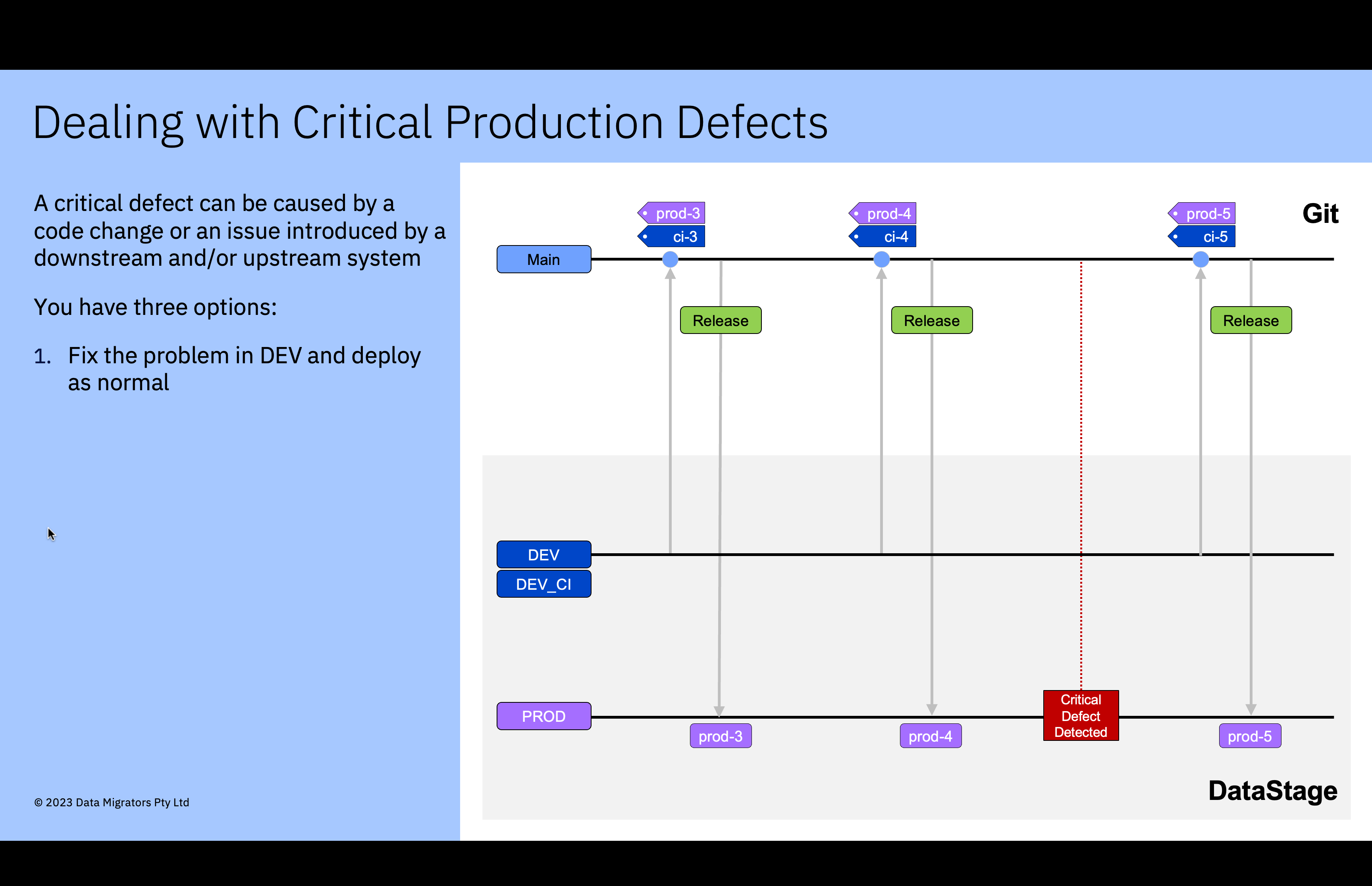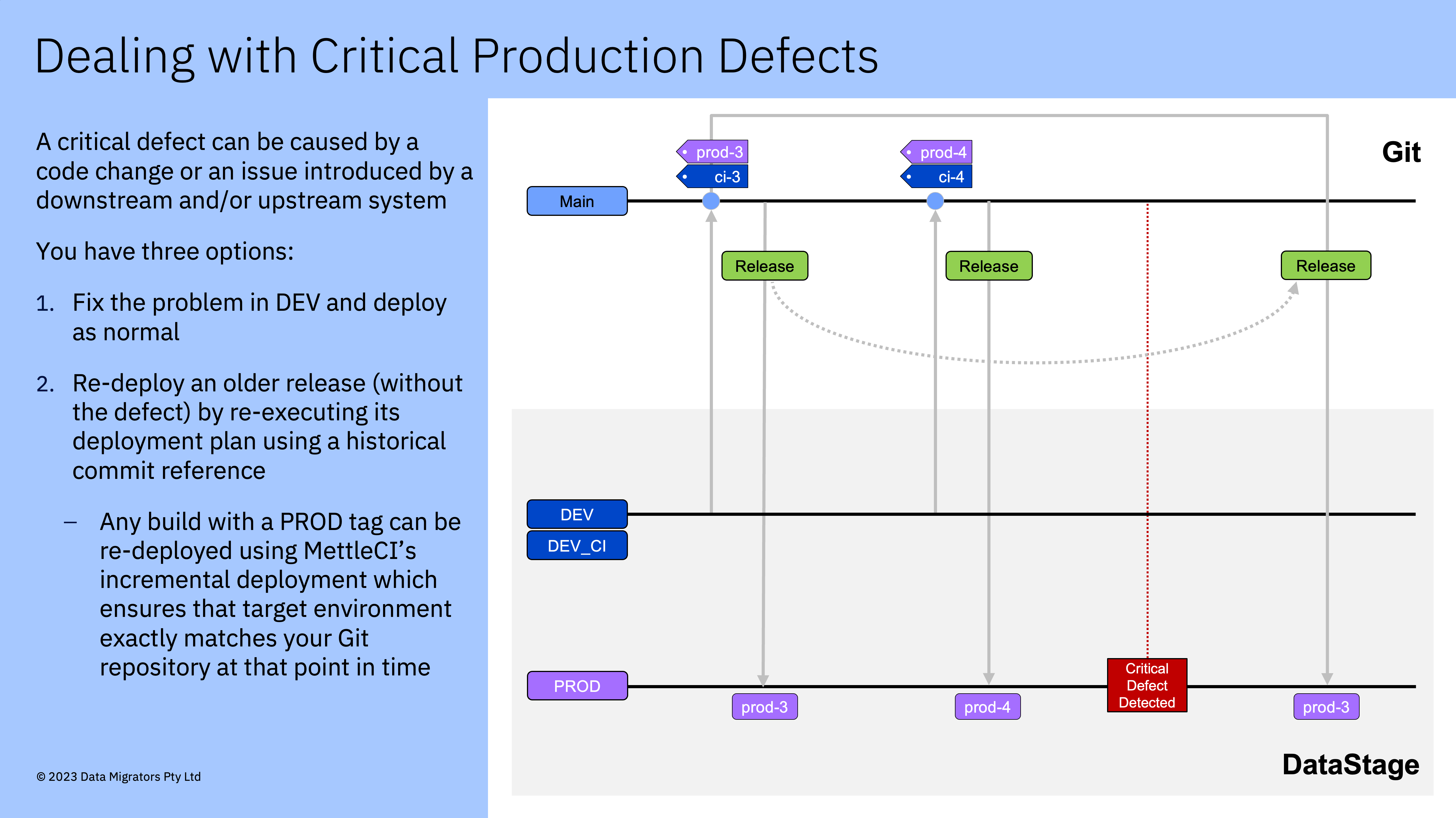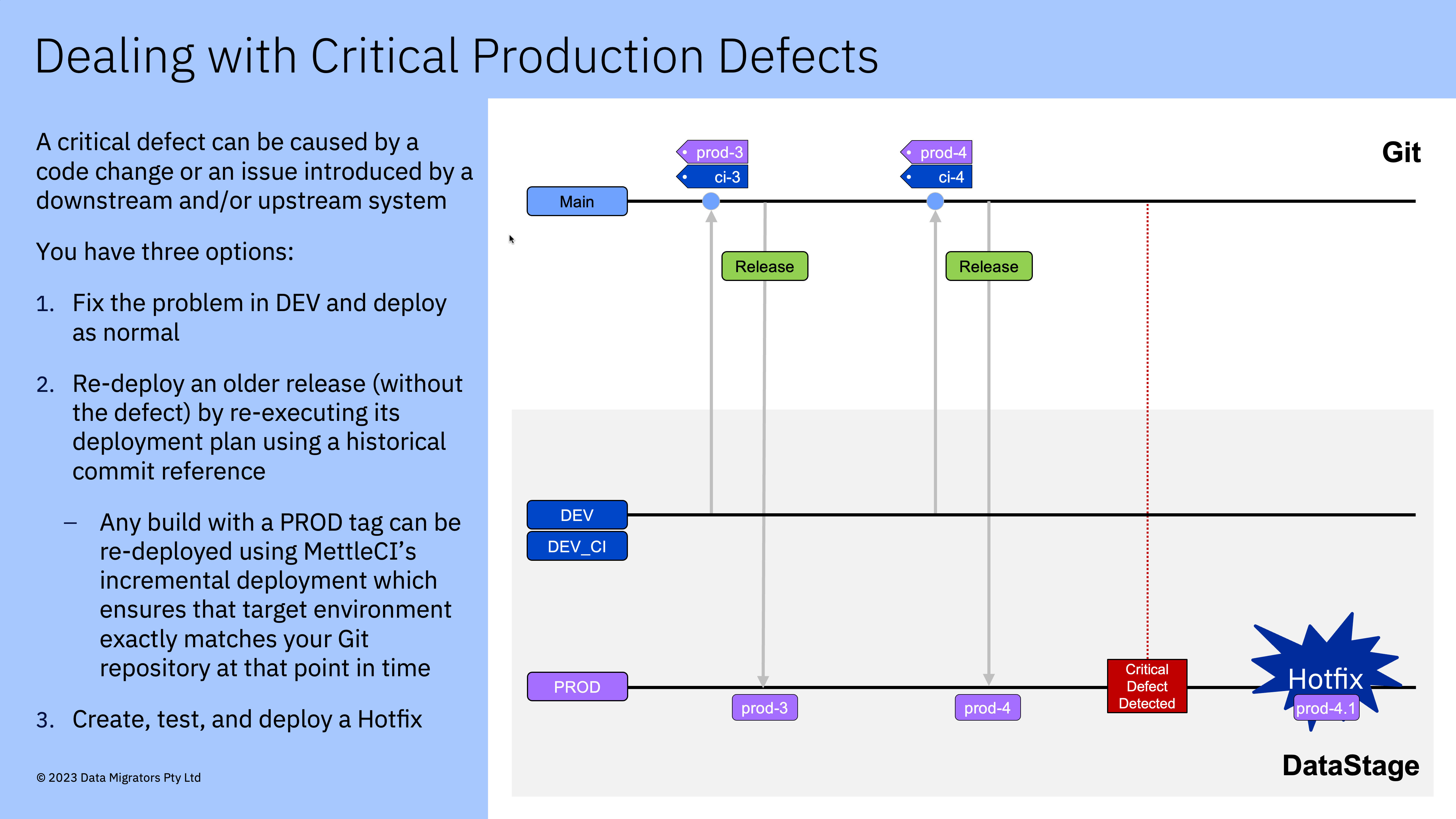 The MettleCI deployment process will synchronise the complete configuration of your Git repository to the target environment (Production). For this reason, the use of this approach requires that no commits have been made to the Git repository since the repository’s codebase was promoted to Production. This may mean that the development of a hotfix may require pausing the development of new features (or of other, non-time critical defects) in your shared Development environment.