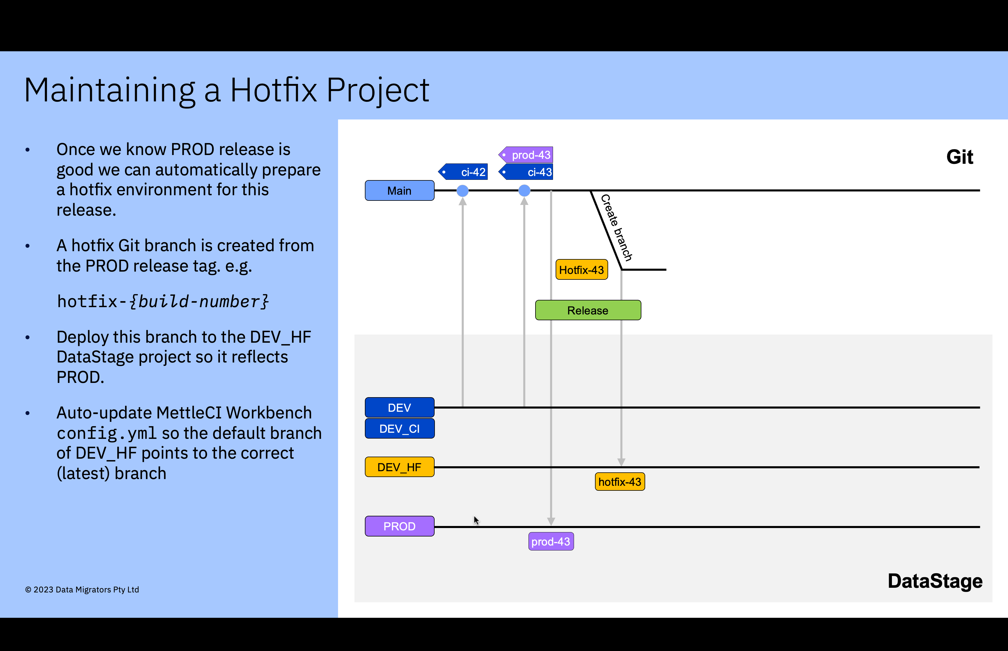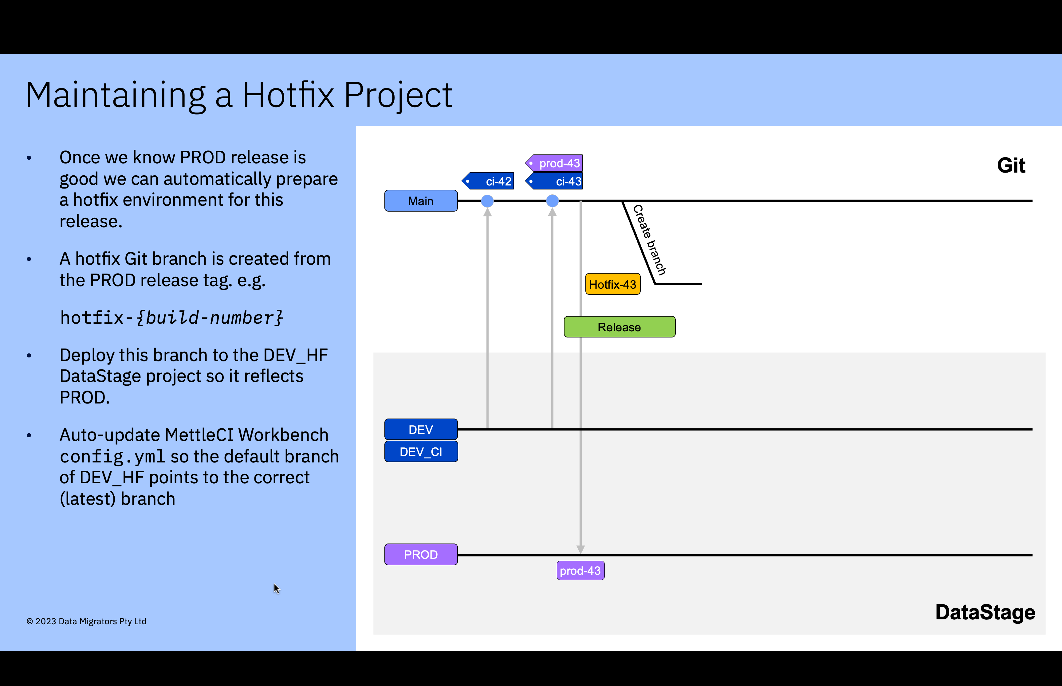 Each deployment to production will also involve the deployment of the latest production code configuration to the hotfix development project. The same hotfix development project is used for every hotfix branch, and it is simply updated to mirror whatever software configuration is currently in production. Each time this happens, MettleCI Workbench needs to know which Git branch the hotfix development project currently represents. This is achieved by updating Workbench’s project registration information from your release deployment plan by having it call the workbench set-branch (documentation) command. This is demonstrated by the example hotfix pipelines provided with MettleCI.