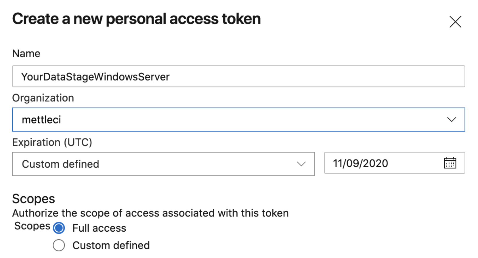 Select New Token and enter the name of your Windows machine, select your Azure organisation, specify your token’s expiry period, and select a scope of Full access.