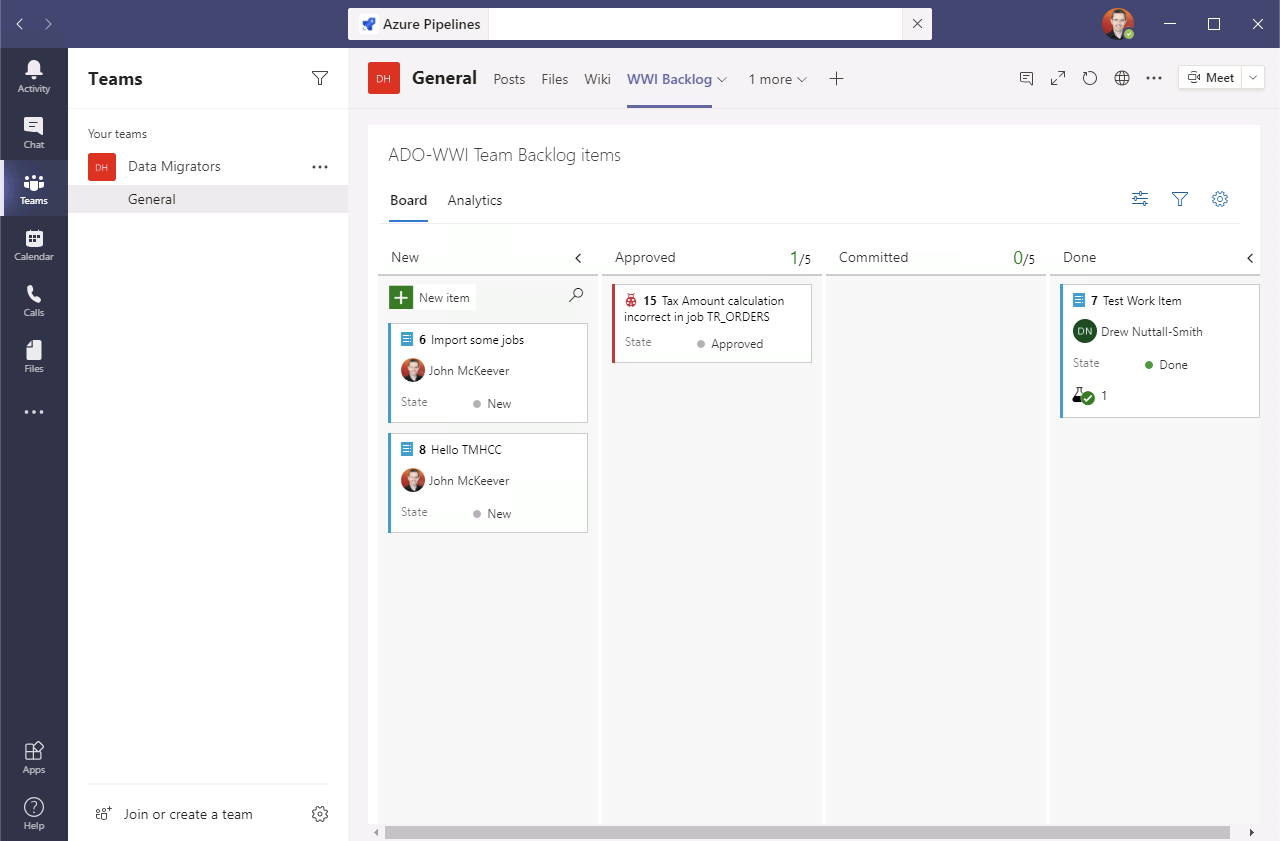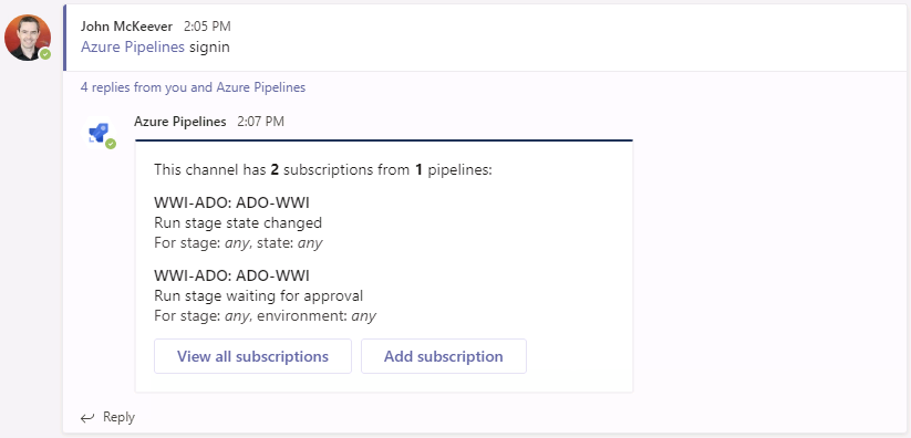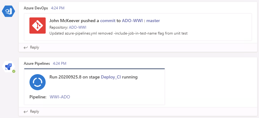 Configure Azure DevOps to automatically post activity updates to your team’s channels: Instructions here