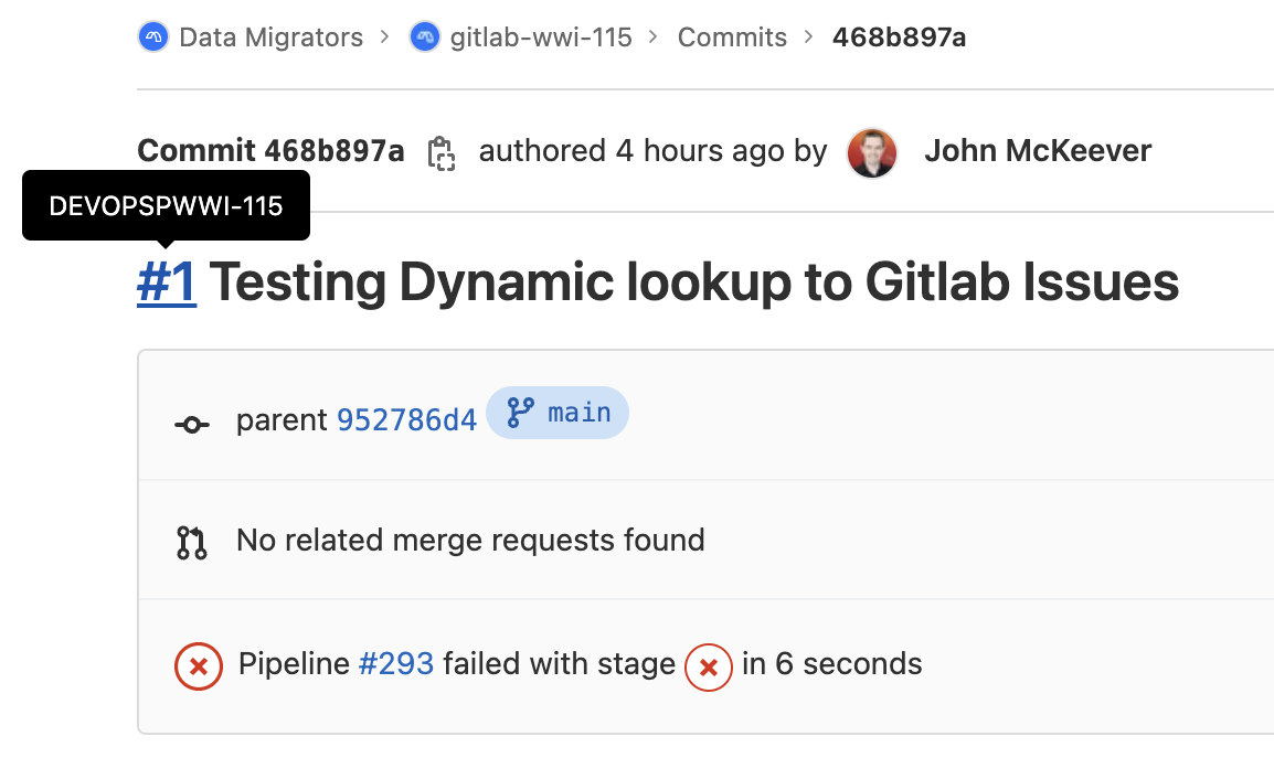 Navigate to GitLab → Repository → Commits. Select your commit and verify that the specified Issue has been associated with it. e.g.