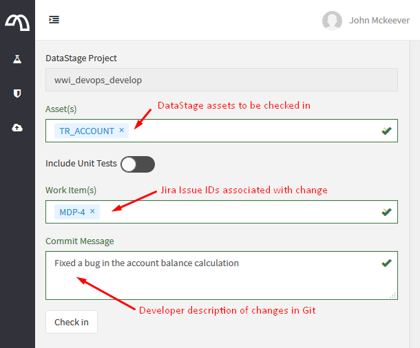 MettleCI Workbench is an on premise, web based application which allows DataStage developers commit their changes to Git/Bitbucket and to leverage modern development practices. When a DataStage developer initiates a Git commit via MettleCI Workbench, they are presented with the following screen that allows them to select the DataStage assets to commit, associate one or more Jira Issue IDs and add a brief description of the change: