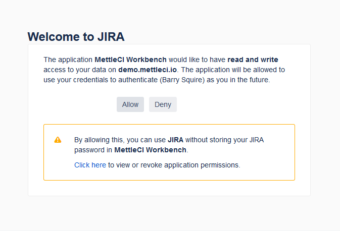 Enabling OAuth integration between Jira and MettleCI Workbench doesn’t immediately grant MettleCI Workbench any access to actions or data within Jira. Instead, when MettleCI Workbench first attempts to fetch a list of Jira issues on the current user’s behalf, the user will be redirected to the Jira login page and, after successful login, will be prompted to grant access to MettleCI Workbench. This login process is performed on your Jira instance and MettleCI Workbench never has access to any usernames or passwords: