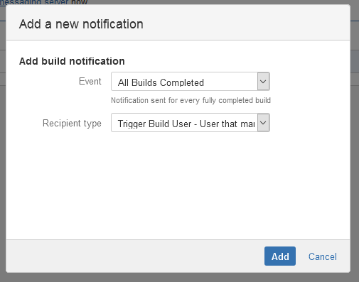 Complete the Add Build Notification settings form with the appropriate Event and Recipient Type values.
