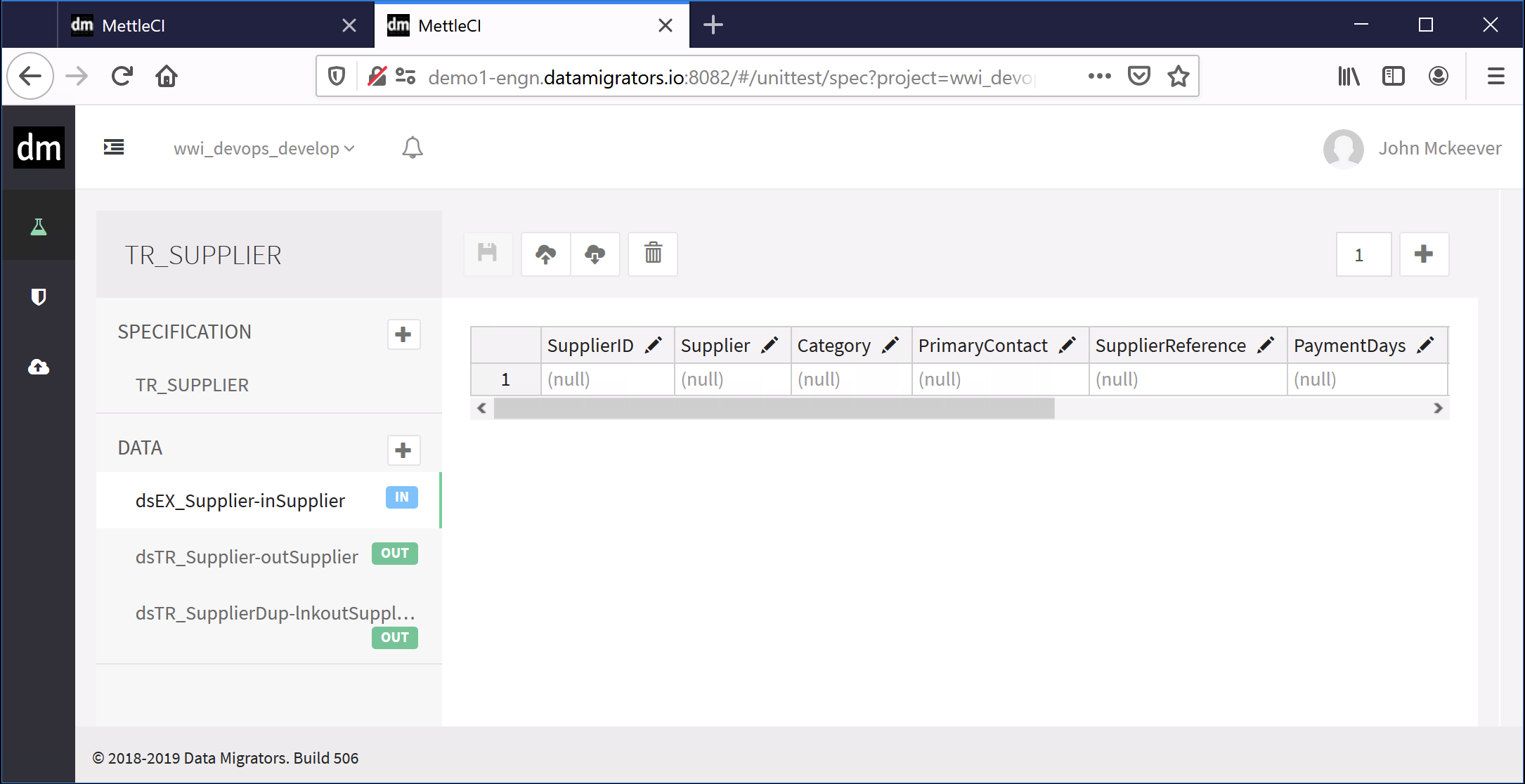 Once you’ve created your Unit Test the data files comprising your test specification are listed on the left of the Unit Test editor. Selecting each of these will display it on the right-hand pane of the editor in an Excel-like tabular view.