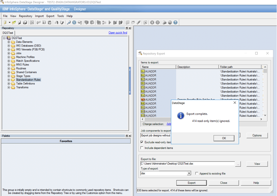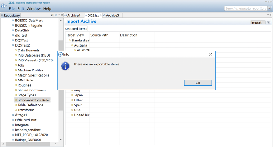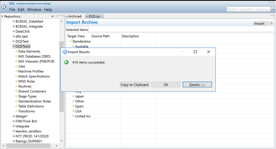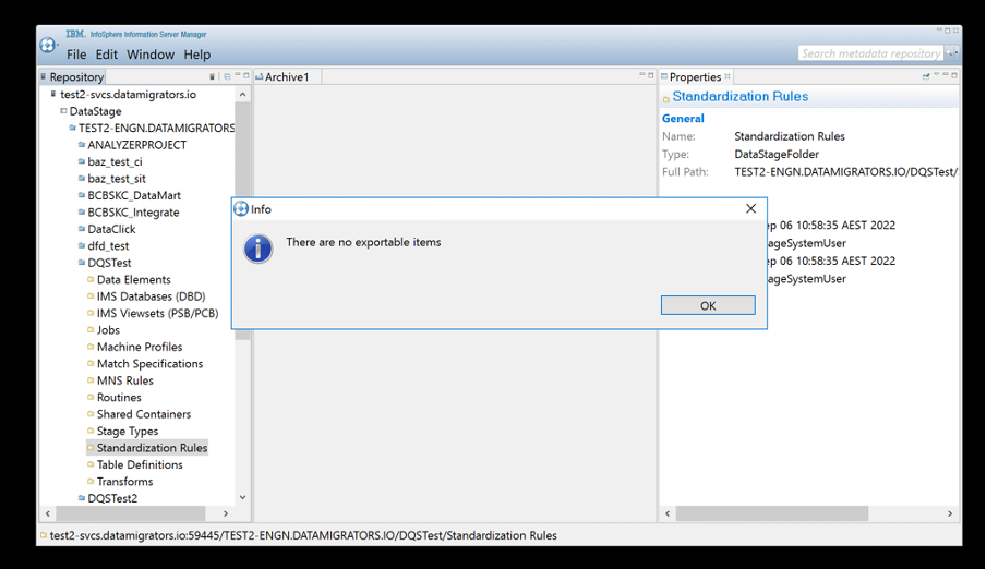 Now consider an example project DQSTest2, which is the project the .isx extract featuring the problematic QualityStage assets is being deployed (where assets are imported using istool prior to compilation).