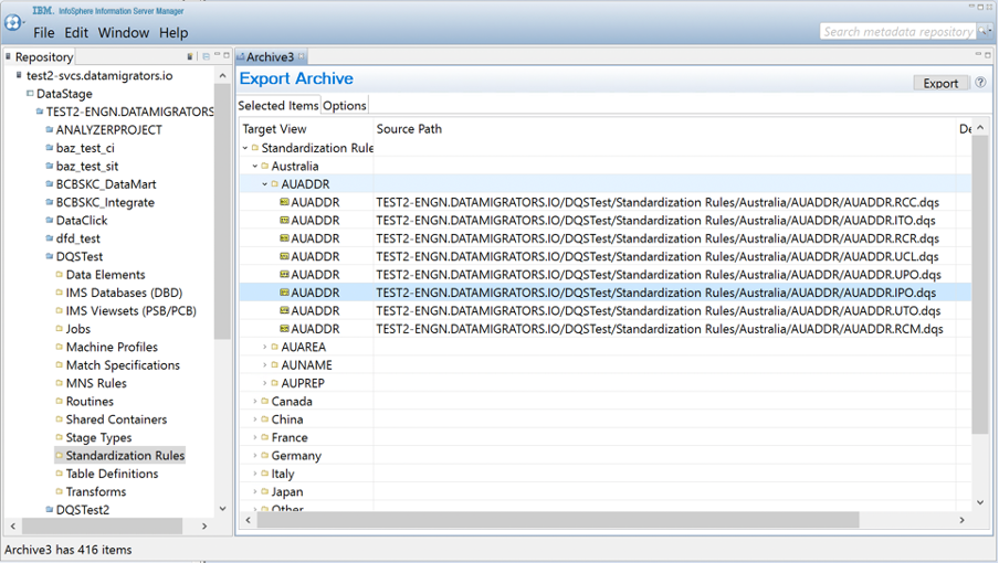 In summary, previous exports and imports of those files using a .dsx file format will alter the way in which the istool export process treats those file. Specifically, . and how it differs from Information Server Manager and istool methods in relation to the out-of-the-box Standardisation Rules.