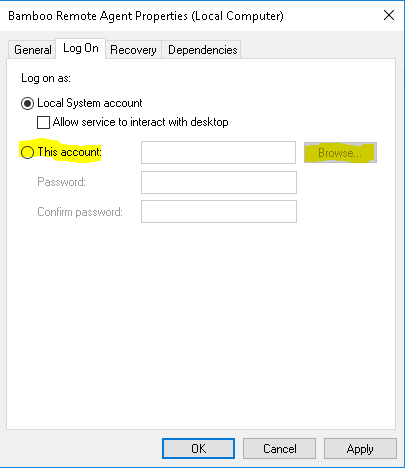 Click the “Log On” tab, Select “This account” and click the “Browse…” button.