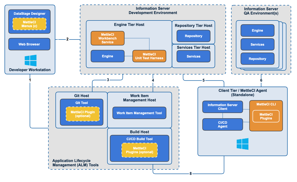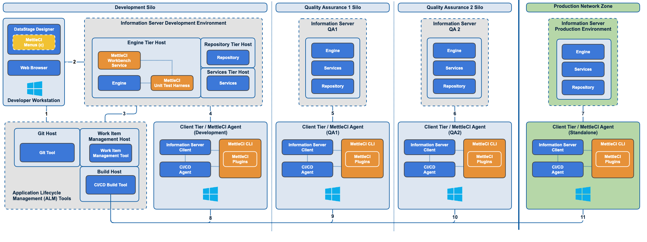 This topology is appropriate when each DataStage environment requires its own MettleCI Agent host, usually as a result of organizational security policies.