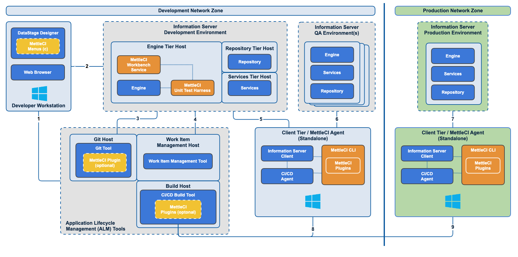 This topology is appropriate when it’s not permitted for a single MettleCI Agent host to connect to every DataStage environment and network zone. In particular, this topology is useful when a single instance of a CI/CD Agent is not permitted to access non-Production and Production environments/network zones.